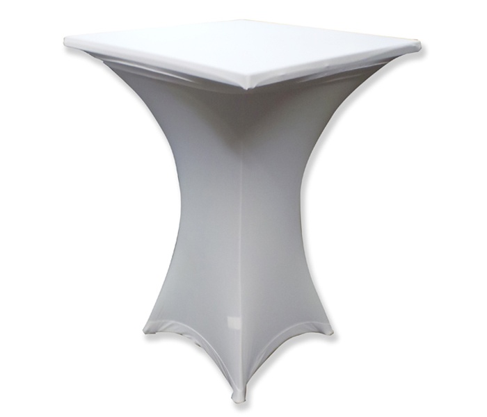 Een strakke witte stretchrok met bijpassende tophoes, speciaal ontworpen voor statafels van 80x80 cm. Het elastische materiaal sluit nauw om de tafel en zorgt voor een nette afwerking zonder plooien. De tophoes beschermt het tafelblad en maakt de presentatie compleet. Ideaal voor evenementen waar een frisse en verzorgde uitstraling gewenst is.