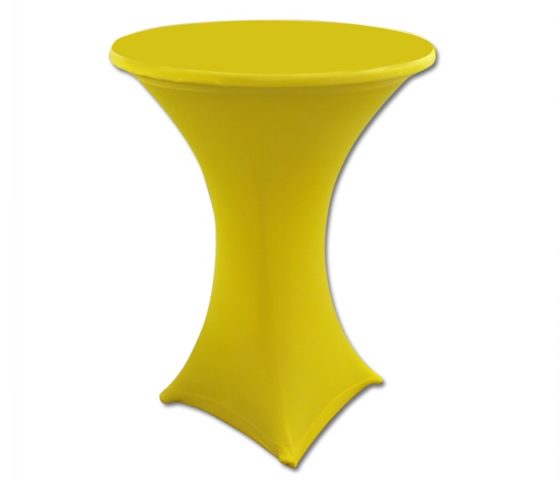 Een frisse gele stretchrok met bijpassende tophoes, speciaal ontworpen voor statafels. Het elastische materiaal sluit strak om de tafel en zorgt voor een nette afwerking zonder plooien. De tophoes beschermt het tafelblad en maakt de presentatie compleet. Ideaal voor evenementen waar een vrolijke en opvallende uitstraling gewenst is.